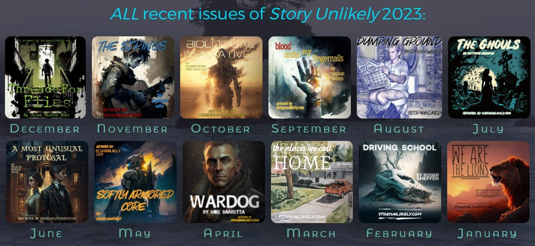 This page is for paid members to the Story Unlikely monthly magazine, where you can access and read the latest stories hiding behind our obnoxious paywall, back issues, articles on improving your writing, and more! Not a member? Click the "Create Account" button below to sign up! Already a member? Log in below.